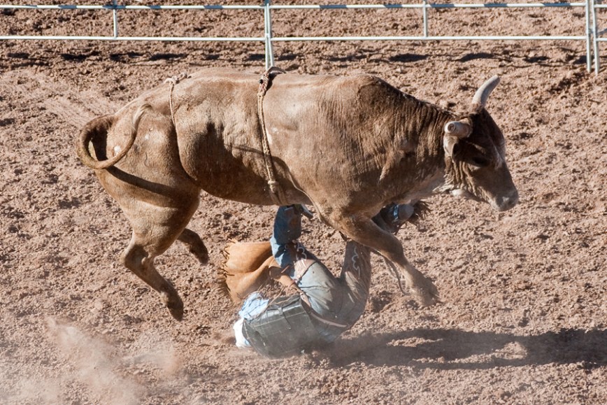 The biggest draw, across the board, is always the bull riding. Most folks agree that the bull-riding roster is populated by madmen. You’d have to be to consider sitting your ass on an seething mound of angry beef ten times your size. It’s my humble opinion that, at the end of the day, it takes an unusual combination of absolute lunacy and skill-tempered bravery to ride one of these monsters. But then, as the danger is ratcheted up – that and the promise of possible injury – it’s hard to un-stick our eyes from the rattling cage before the chute doors swing open. I don’t want to downplay how strictly regulated these events are – but the danger is real. And hell, there’s something about a wind-burned crowd, stomping their feet on the floorboards, huddled beneath the shade of their hats, quietly praying for blood.