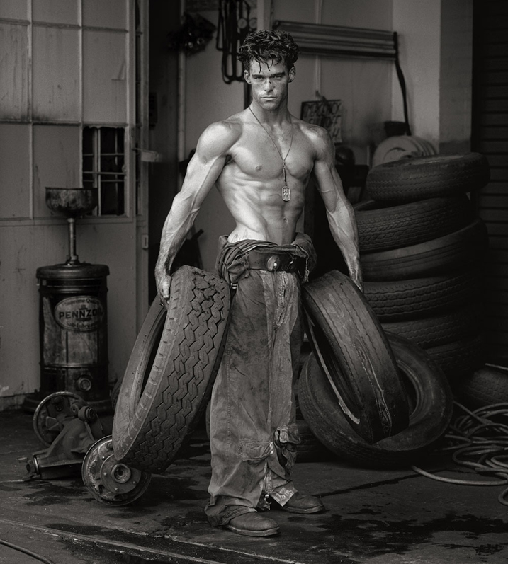 It had to happen. While watching the new “Deadpool” film opening night, this image immediately struck my psyche. I was immediately reminded of famous fashion and celebrity photographer Herb Ritts and one of his famous – and famously gay – portraits of a muscled man holding tires. His body of work is impressive, and I count him among one of the photographers who truly inspired me, even though I never developed in to a studio portraitist.