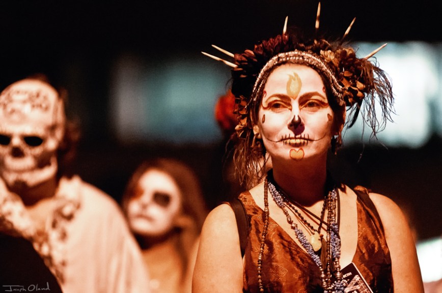 Tens of thousands participate every year. People start to gather along 4th and 6th avenues before sun-down, arriving in costume, tailgating and helping paint each other’s faces in a fashion reminiscent of Day of the Dead. Jugglers and street performers, musicians and stilt-walkers weave through the throngs of people. Participants are encouraged to write notes to the dead on pieces of paper and deposit them into a giant urn that leads the procession – once the urn reaches the end of the procession, it is elevated above the crowd and set ablaze.