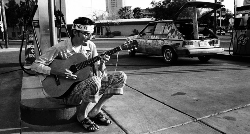 I could write a hundred-page essay about ‘Omni,’ and I’m still considering it. There’s no way I could distill the qualities of this person into a quick post like this. I met Omni on 4th Avenue near downtown Tucson. During the entire time I knew him, he was living out of his car, a Dodge Omni, and spent his time in local coffee houses writing “spells” into Bibles lifted from hotels, playing open-mic nights, scribbling artwork and signs on cardboard, and strumming the strings on street-corners. He was a pleasant guy, and often made friends with local college students and kindred hippie spirits, so he never went too long without a decent meal or a shower.
