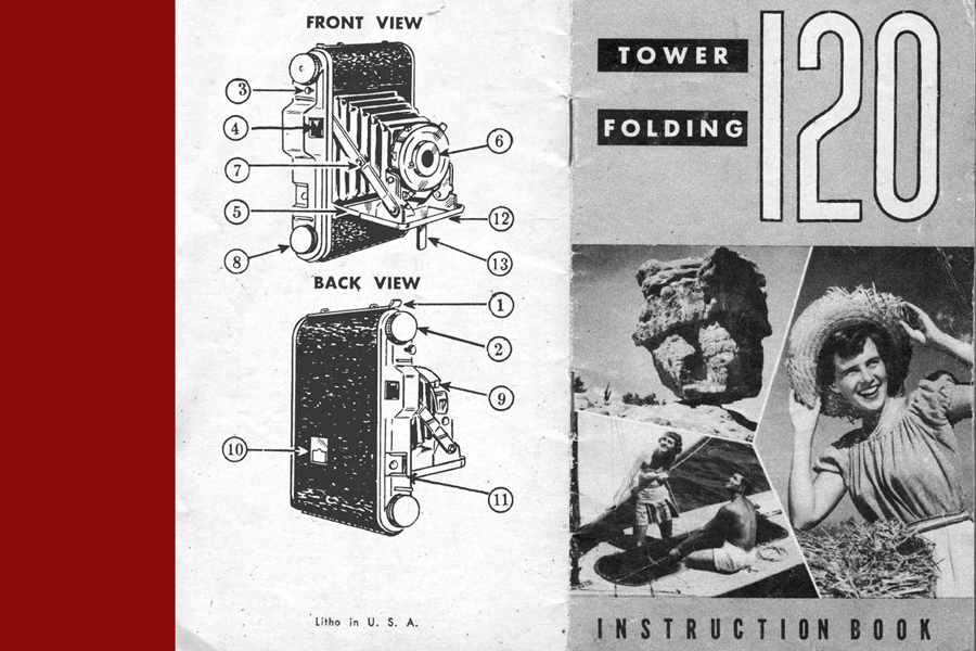 tower folding postThe 1950s saw continued expansion in casual consumer photography. Film costs were prohibitive, but newer models with ease-of-use features attracted new buyers. Bulkier, double-lens cameras (the twin-lens reflex model) were still considered the gold-standard for press photographers, but folding cameras had quickly begun to replace box cameras. Kodak’s turn-of-the-century innovations – the ‘Brownie’ and ‘Brownie No.2’ – fell out of fashion as cameras such as the 1950s Tower series arrived, manufactured and distributed by Sears, Roebuck & Company.